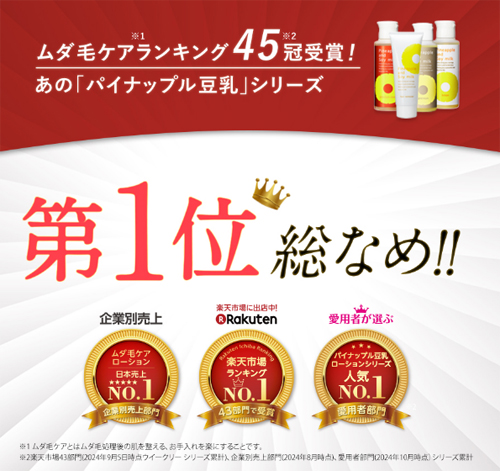 「パイナップル豆乳除毛クリーム」は15年以上のロングセラー・楽天の除毛剤ワックスクリーム部門でナンバーワン(週間ランキング)を獲得した医薬部外品の除毛クリームです。