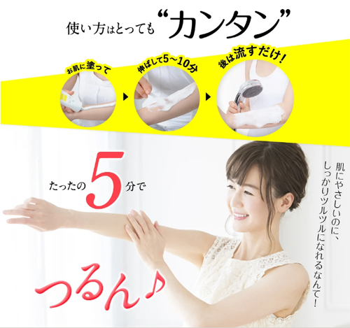 使い方はとても簡単。パッチテスト後、腕・脚・脇など気になる部位に厚めに塗布し、5〜15分放置。