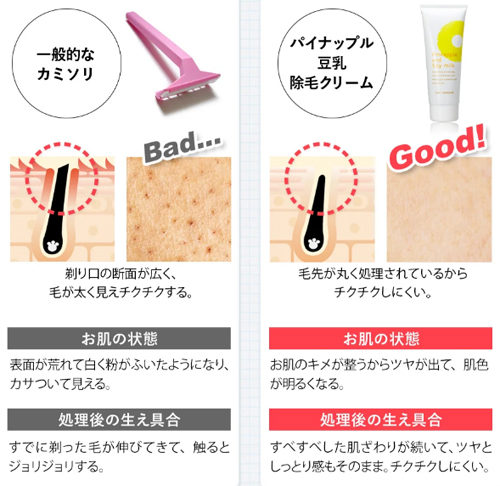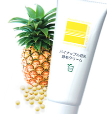パイナップル豆乳除毛クリームは、成分の中に大豆イソフラボンが配合されていて除毛処置後の肌がつるりと仕上がるという特性を持ちます。