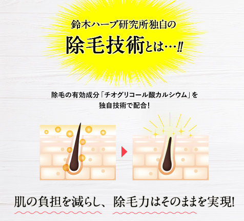 カミソリのように除毛する際に皮膚を傷つけることがないよう、除毛の有効成分チオグリコール酸カルシウムを独自技術で配合し肌を守りながら除毛することができます。