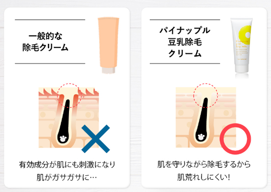パイナップル豆乳除毛クリームの商品の特徴は脱毛をしつつ、肌ケアを可能としている点になります。