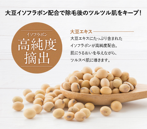 これは大豆イソフラボンが持つ保湿効果が働くことで除毛処置後の肌が保湿され潤いがキープされるという仕組みによるものです。